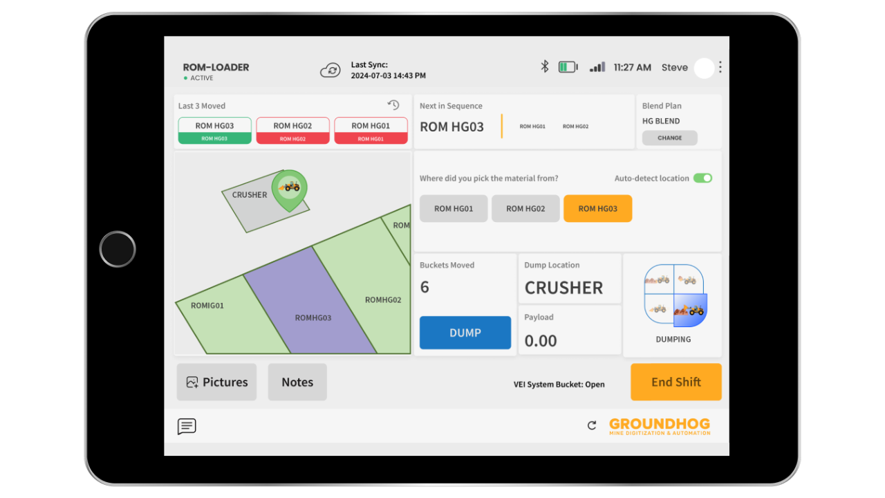 The GroundHog ROM Loader Software is a powerful solution designed to streamline material handling in mining operations by integrating seamlessly with wheel loaders. Equipped with VEI sensors, it tracks the bucket’s weight and position with precision, ensuring accurate loading and