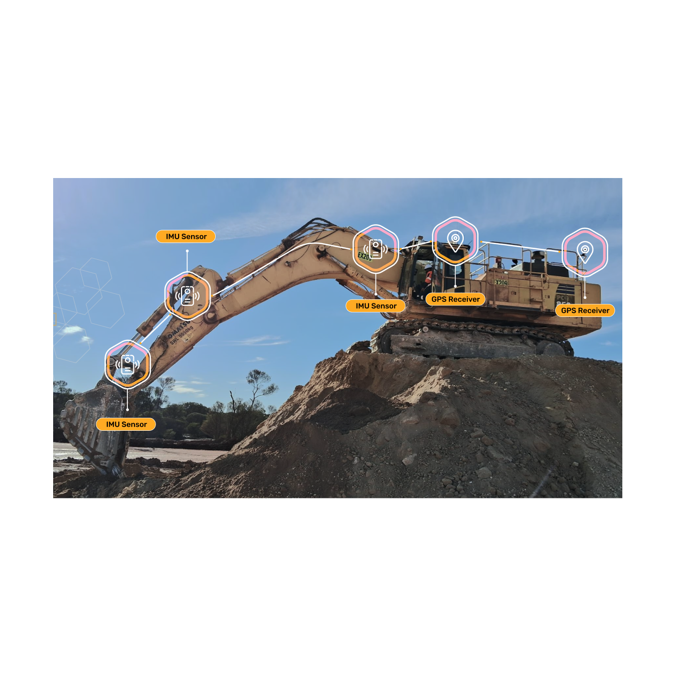 The FMS for High Precision Digging process involves several key components: Two GPS RTK receivers are installed atop the cab, while three third-party IMU sensors are positioned along the boom. GroundHog’s FMS software processes data from these GPS receivers and IMU sensors to calculate the shovel tip’s position.