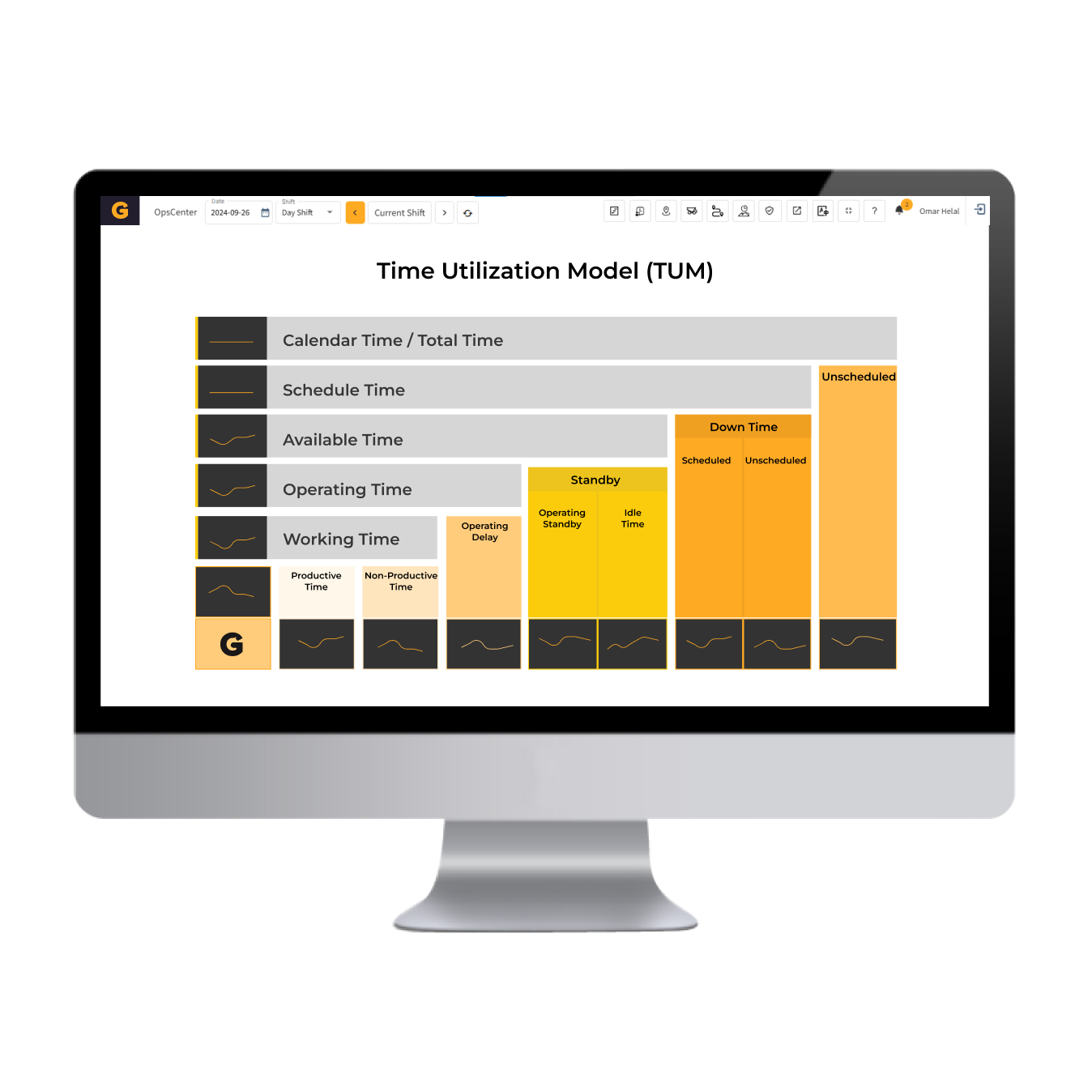 The ROM Loader Software includes a Time Utilization Model (TUM) that monitors operational metrics such as vehicle breakdowns, blend plan changes, and non-productive time.