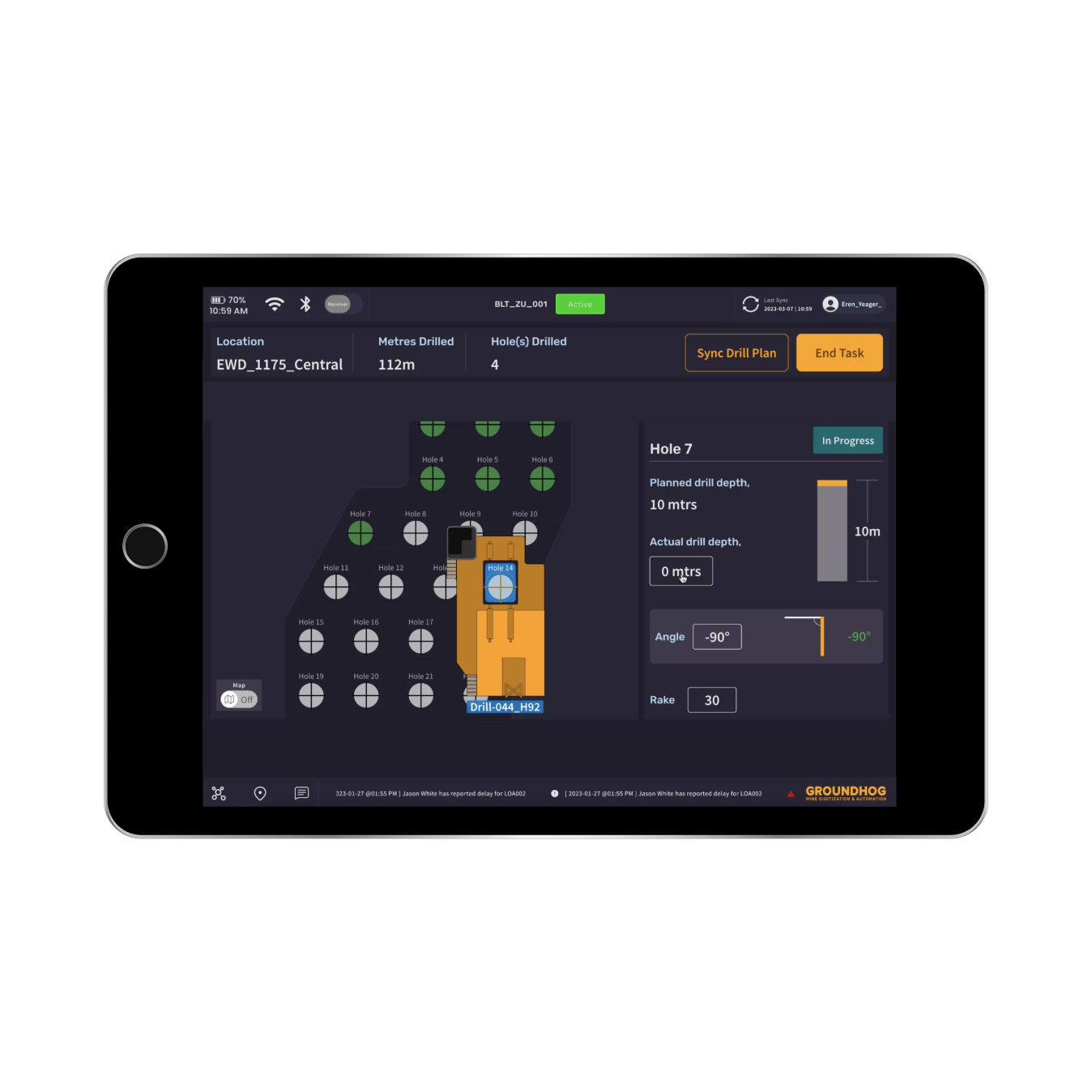 Mine engineers or dispatchers upload the drill plan to the GroundHog OpsCenter, where it is securely stored in the cloud. This plan is then instantly available in real-time on the drill operator’s application, ensuring efficient communication and smooth execution of the drilling plan.